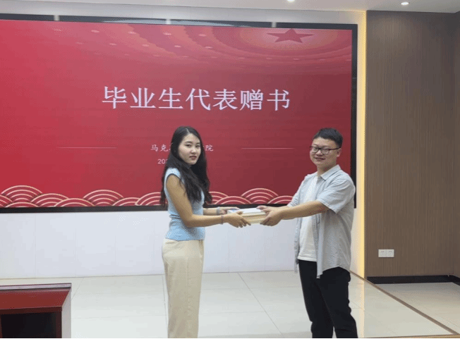 随后,赠书仪式上,优秀毕业生丁薇学姐向2022级学生代表进行赠书,并向学弟学妹们送上自己最真挚的祝福。