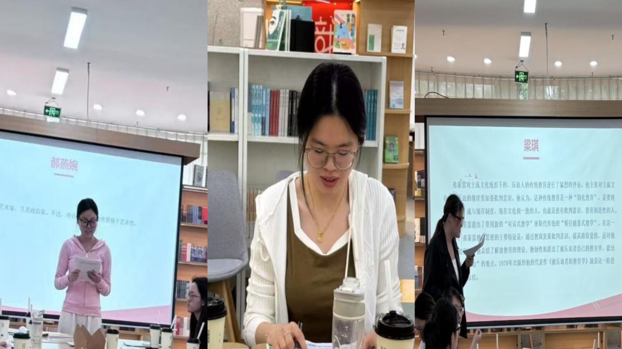 张悦悦主要倡导弗莱雷教育理念,反对学科内容以晦涩术语、空洞理论或孤立事实呈现,主张依据学生经验、用学生语言将内容作为问题提出,让学习内容与生活思想融合。刘欣引用《被压迫者的教育学》指出,解放不是一个人能单独完成的事。没有人能单方面拯救他人,也无法仅靠自己实现解放,真正的自由需要大家一起行动,通过改变现实来共同获得。只有当人们团结起来,在行动中不断反思和调整,才能打破压迫的循环。张艺璇通过引用《被压迫者的教育学》中的核心观点,强调解放的本质是通过行动与反思的实践实现人性化。指出教育应成为揭露现实矛盾、推动社会正义的工具,师生需以平等身份共同探索问题,在行动中检验反思成果,最终打破压迫循环,重建人性尊严。