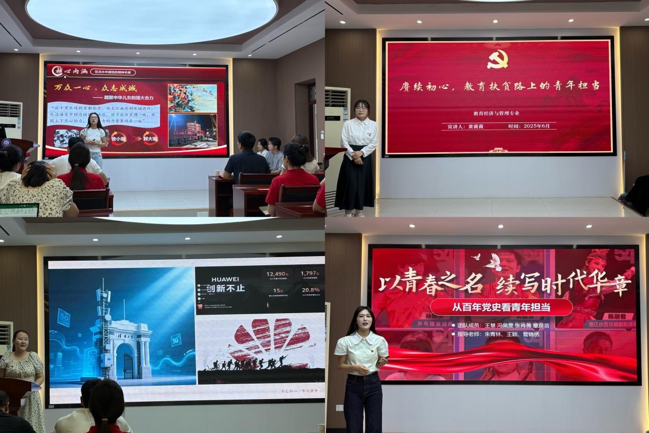 张楠则用生动的语言阐述了抗洪精神。这一精神既展现了吴良珠、于逸飞等英雄人物的顽强拼搏,也体现了举国上下的团结合力。黄薇薇通过张玉滚等教师的感人故事,展现了教育扶贫的力量。齐媛媛指出教育、科技、人才是现代化国家建设的核心,呼吁青年在教育强国中担当作为。王慧通过百年党史中青年群体的典型事迹,展示了青年在不同历史时期的担当。