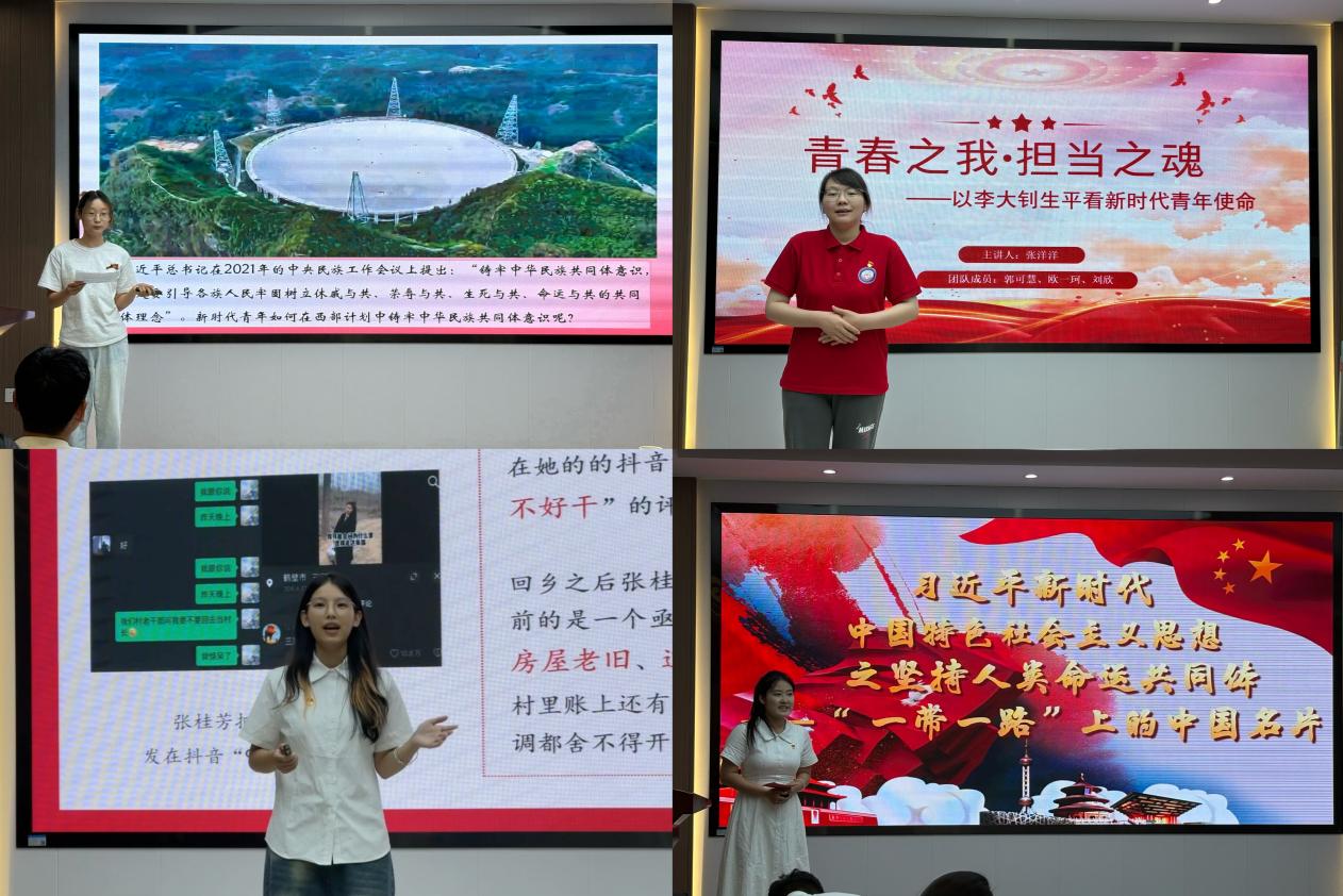 李娟从西部计划的意义、坚守与共鸣三方面探讨了新时代青年如何通过西部计划铸牢中华民族共同体意识。张洋洋回顾了李大钊的生平事迹,激励新时代青年心怀天下、脚踏实地。刘子凤则以“青春赴乡野 热血绘新颜”为题,讲述了95后村支书张桂芳及自身参与实践活动的故事。吕新宇以“习近平新时代中国特色社会主义思想之坚持人类命运共同体——‘一带一路’上的中国名片”为主题,呼吁青年要贡献青春力量。