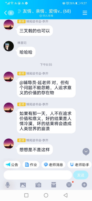 李齐老师对会议做出总结,肯定了同学们的分享内容,并针对“完美的罪行”何以成为现代文明时代的一种形象为由,提出了要以马克思主义理论来识破幻象化生活的空洞与虚妄,并以马克思主义作为我们认识世界和改变世界的思想武器,一定能够构建起通向人的全面自由发展的道路。最后,李齐老师指出,相信同学们会以梦为马、不负韶华,与马院共同成长,奔赴美好未来。